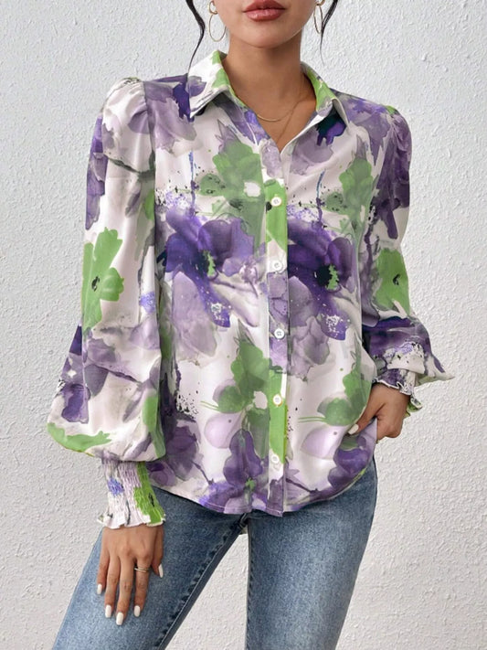 Perfee Leopard Notched Neck Puff Sleeve Blouse